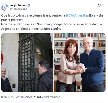 Jorge Taiana se reunió con Cristina Fernández este domingo tras emitir su voto y a pocas horas de que cierren los comicios. El candidato por Fuerza Patria será protagonista este domingo en el búnker del partido en La Plata.
