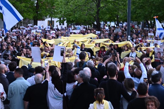 Los concurrentes siguieron con atención los discursos de los familiares y además de hacer un minuto de silencio en el que sobresalieron las luces de los teléfonos celulares, formaron un lazo amarillo con el que simbólicamente abrazaron a las 48 personas que aún siguen cautivas en manos de la organización terrorista palestina.