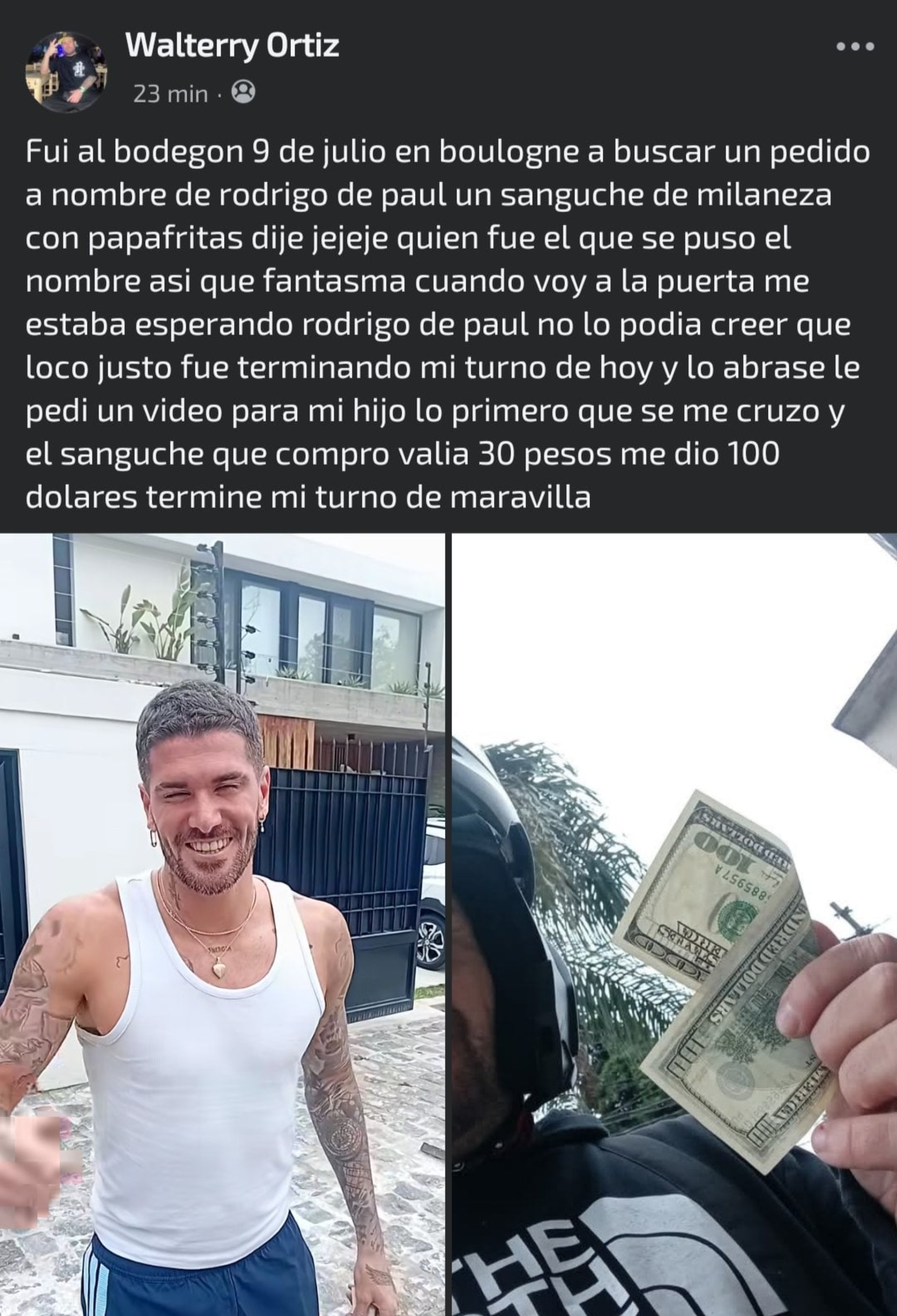 Walter Ortíz, un repartidor de la zona de Boulogne, relató como fue su encuentro con el campeón del mundo Rodrigo De Paul donde, no solo se llevó una codiciada selfie, sino también una propina más que generosa.