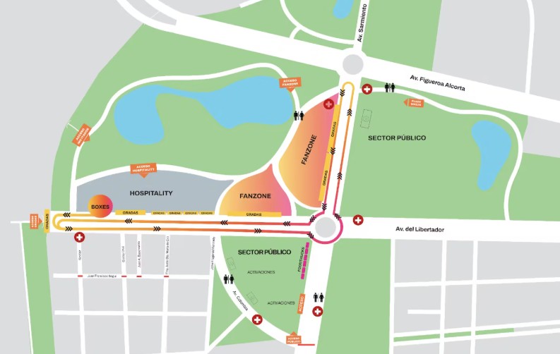 El recorrido tendrá lugar en el barrio de Palermo, sobre avenidas emblemáticas como Libertador y Sarmiento, e incluirá el paso por el Monumento de los Españoles, donde además se montará una especie de box para el evento.