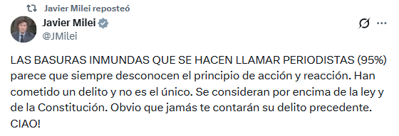 “LAS BASURAS INMUNDAS QUE SE HACEN LLAMAR PERIODISTAS (95%) parece que siempre desconocen el principio de acción y reacción. Han cometido un delito y no es el único. Se consideran por encima de la ley y de la Constitución. Obvio que jamás te contarán su delito precedente. CIAO!”, sostuvo el mandatario, en referencia a que un acreditado filmó los pasillos internos de la sede gubernamental con una cámara oculta, tras lo cual se decidió el cierre de la Sala este jueves.